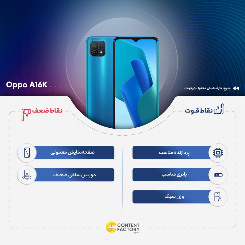 بسیاری از کاربران بهدنبال ترجیح میدهند با هزینهای به نسبت کم، گوشیهای هوشمندی را خریداری کنند که توانایی ارائه عملکرد قابل قبولی در اجرای فعالیتهای روزمره داشته باشند. بهترین انتخاب برای این دسته از کاربران بدون شک گوشیهای اقتصادی هستند. اوپو A16K هم یکی از همین محصولات است که با توجه به قیمت مقرون بهصرفه و مشخصات فنی بسیار قابل قبول، میتواند با ارائه عملکرد کاملا مناسب، گزینه بسیار خوبی در بین گوشیهای اقتصادی باشد. این گوشی از صفحهنمایش با ابعاد 6.52 اینچ و رزولوشن 720×1600 پیکسل از نوع IPS بهره برده و با توجه به میزان روشنایی 480 نیت (nits) و توانایی نمایش 269 پیکسل در هر اینچ، در شرایط نوری متنوع وضوح تصویر مناسب و خوانایی آیکونهای خوبی دارد. در قسمت پشتی تنها یک سنسور دوربین عریض با رزولوشن 13 مگاپیکسل را شاهد هستیم که برای ثبت تصاویر در نور روز گزینه قابل قبولی است. دوربین سلفی 5 مگاپیکسل این گوشی هم در تماسهای تصویر عملکرد کاملا قابل قبولی دارد. حضور پردازنده هلیو G35 شرکت مدیاتک سبب شده تا نگرانی برای اجرای بازیهای محبوب و نرمافزارهای کاربردی نداشته باشید و در مجموع بهخوبی از پس فعالیتهای روزمره برمیآید. باتری 4230 میلیآمپرساعت این گوشی هم در شرایط استفاده معمولی، توانایی ارائه طول عمر مفید کمی بیشتر از یک روز را ارائه میکند.