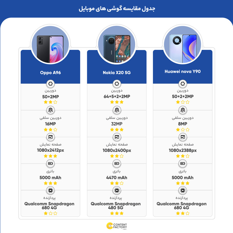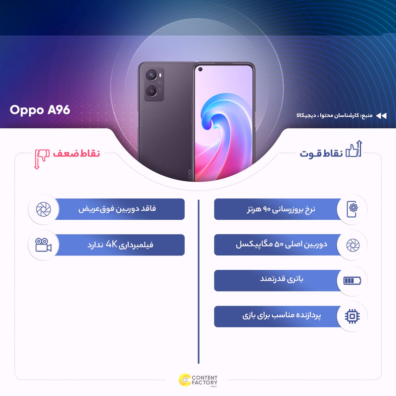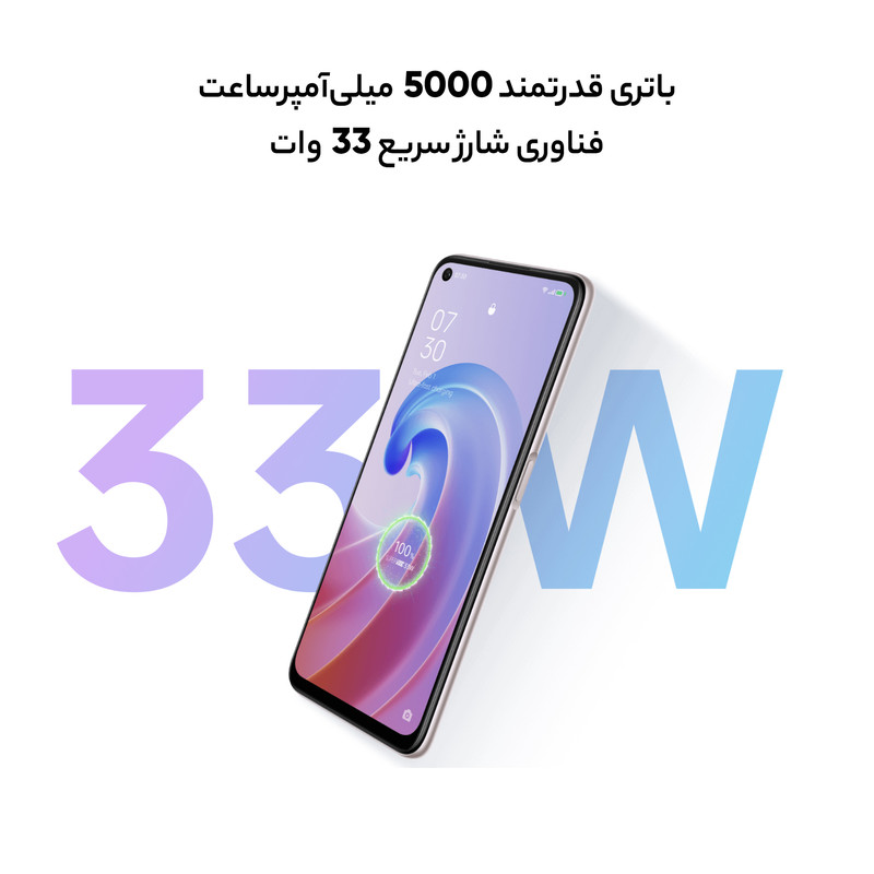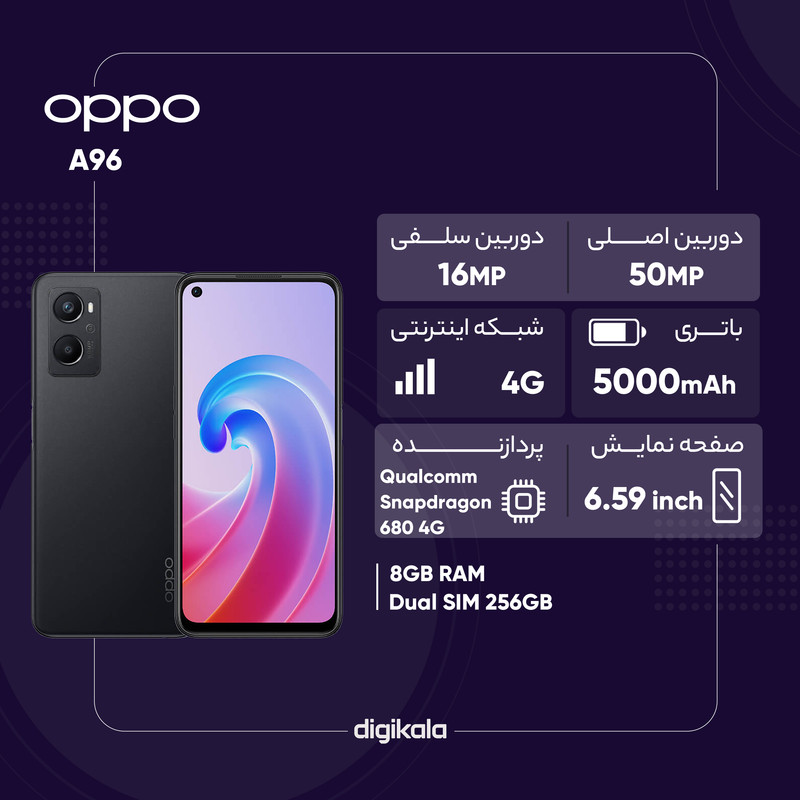 اوپو A96 یکی از گوشیهای هوشمند میانرده مقرون بهصرفه این شرکت است که بسیار مناسب برای آن دسته از افرادی است که میخواهند با هزینهای مناسب، گوشی هوشمند میانردهای را خریداری کنند که با توجه به بهره بردن از مشخصات فنی خوب، عملکرد بسیار قابل قبولی داشته باشد. این گوشی به صفحهنمایش با ابعاد 6.59 اینچ و رزولوشن 1080×2412 پیکسل از نوع IPS مجهز شده که از جمله قابلیتهای قدرتمند این صفحهنمایش میتوانیم به نمایش 401 پیکسل در هر اینچ، نرخ بروزرسانی 90 هرتز و حداکثر روشنایی 600 نیت (nits) اشاره کنیم. در قسمت پشتی یک سنسور دوربین عریض با رزولوشن 50 مگاپیکسل بههمراه سنسور 2 مگاپیکسل سنجش عمق، سنسورهای دوربین دوگانه این گوشی را تشکیل میدهند که سنسور دوربین عریض برای عکاسی در نور روز و نور شب، گزینه بسیار مناسبی است. برای دوربین سلفی هم سنسور با رزولوشن 16 مگاپیکسل در نظر گرفته شده است. حضور پردازنده اسنپدراگون 680 4G سبب شده تا اوپو A96 توانایی ارائه عملکرد بسیار خوبی در اجرای بازیهایی با گرافیک بالا و نرمافزارهای کاربردی را دارد. باتری با میزان ظرفیت 5000 میلیآمپرساعت هم توانایی ارائه طول عمر مفید (زمان آماده بهکار) دو روز را به ازای هر بار شارژ صد درصدی در شرایط استفاده معمولی دارد. پشتیبانی از فناوری شارژ سریع 33 وات هم امکان شارژ صفر تا 50 درصدی را در مدت زمان 26 دقیقه فراهم کرده است.