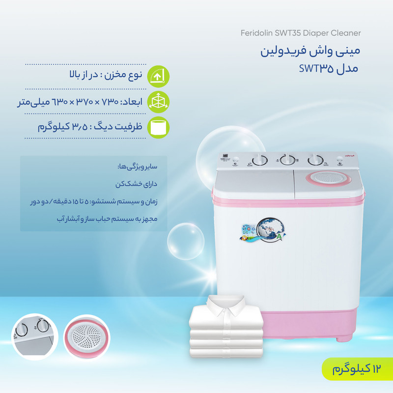 مینیواش «فریدولین» (Feridolin) مدل SWT35، محصولی بسیار ساده، سبک، با ظرفیت بالا و قابلیتهای متنوع است. این مینیواش درب از بالا، در طبقهبندی رنگ ساده ظرفیت 3.5 کیلوگرم طراحی و ساختهشده است. در نظر داشته باشید که این ظرفیت برای یک مینیواش، در مقایسه با دیگر کالاهای مشابهاش، رقم بالایی بهحساب میآید. از دیگر مشخصات این محصول میتوان به مجهز به لولهی ورودی آب سرد و گرم، مجهز به خشککن با ظرفیت 2 کیلوگرم، قابلیت تنظیم ارتفاع آب و دو موتور مجزای شستشو و خشککن اشاره کرد. همچنین این محصول دارای پمپ تخلیه و فیلتر پرز گیر و سوئیچ ایمنی هم است. در نظر داشته باشید که فریدولین، یک شرکت تولیدی صنعتی ایرانی است که پیش از 35 سال سابقه دارد. فعالیت اصلی فریدولین، در زمینهی تولید مینیواش و ماشینهای لباسشویی نیمهخودکار و خودکار در طراحها و مدلهای متنوع است. از ویژگیهای محصولات این شرکت میتوان به استفاده از فناوری روز در تولیدات، صرفهجویی در مصرف آب و مواد شوینده و کاهش زمان شستشوی لباسها اشاره کرد.
