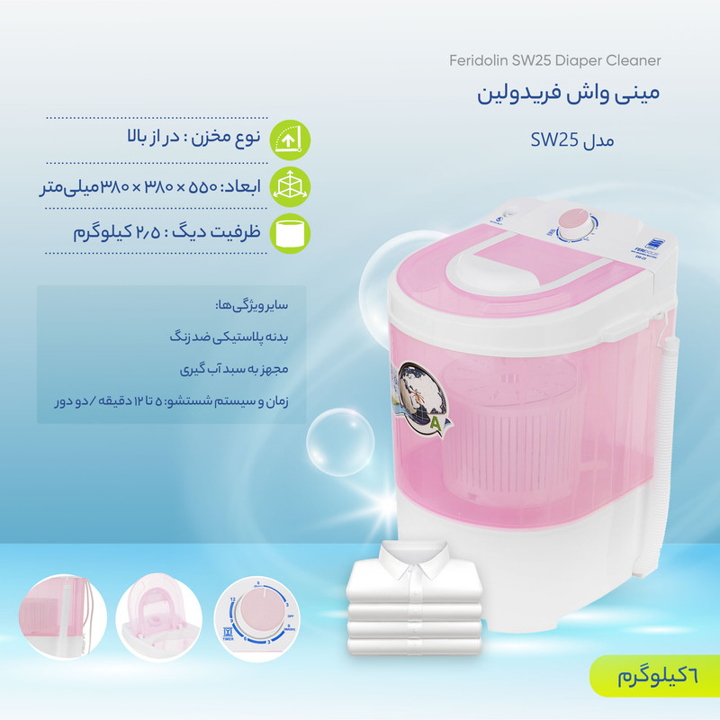 مینیواش «فریدولین» (Feridolin) مدل SW25، یک محصول با تنوع رنگ بالا، وزن نسبتا کم، ظرفیت بالا و طبقهبندی رنگی ساده است. این مینیواش درب از بالا، با وزن 6 کیلوگرم، ظرفیت 2.5 کیلوگرم به همراه لولهی ورودی آب سرد و گرم طراحی و ساختهشده است. بر خلاف دیگر محصولات مشابهاش، SW25 از وجود بخارشو بهره نمیبرد. از دیگر مشخصات فنی این محصول میتوان به قابلیت آبکشی البسه، زمان و سیستم شستشو: 5 تا 12 دقیقه/دو دور (چپ و راستگرد)، زمان و سیستم آبگیری: 3 دقیقه - تک دور و نیروی محرکهی غیرمستقیم اشاره کرد. لازم به ذکر است که SW25 مجهز به کلید سلکتور جهت روشن و خاموش کردن هم است. در نظر داشته باشید که فریدولین، یک شرکت تولیدی صنعتی ایرانی است که پیش از 35 سال سابقه دارد. فعالیت اصلی فریدولین، در زمینهی تولید مینیواش و ماشینهای لباسشویی نیمهخودکار و خودکار در طراحها و مدلهای متنوع است. از ویژگیهای محصولات این شرکت میتوان به استفاده از فناوری روز در تولیدات، صرفهجویی در مصرف آب و مواد شوینده و کاهش زمان شستشوی لباسها اشاره کرد.