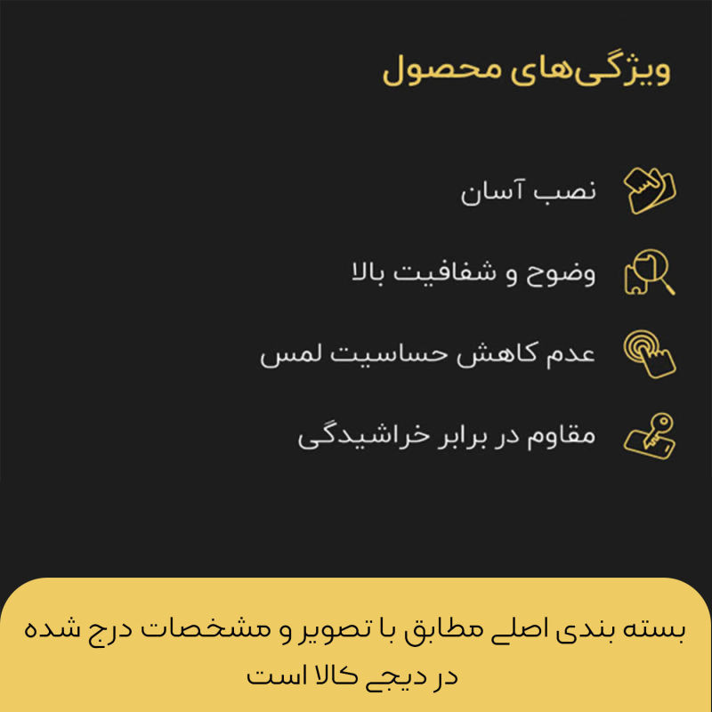 ویژگی‌ها : 9H , جلوگیری از انعکاس نور , جلوگیری از ایجاد خط و خش , قابلیت نصب آسان , مقاوم در برابر چربی و اثرانگشت , مقاوم در برابر خط و خش , نصب بدون حباب