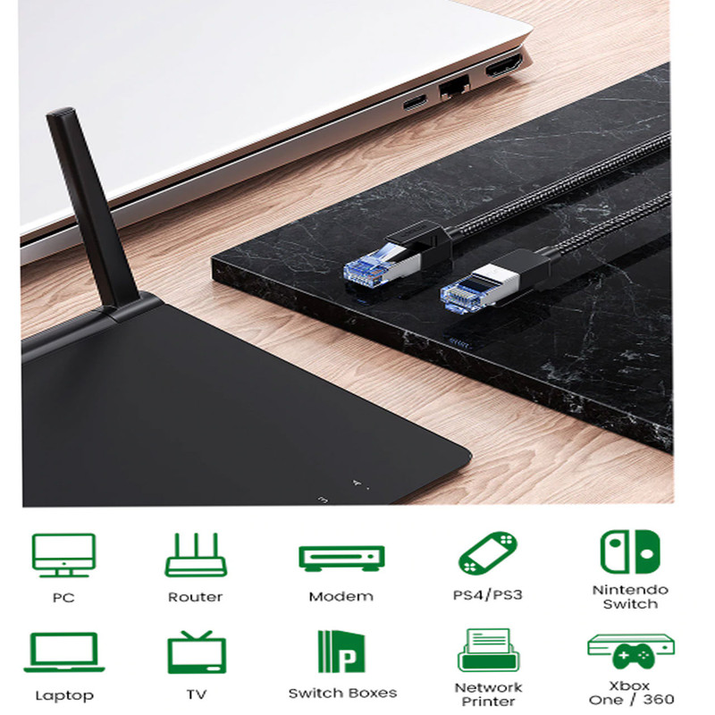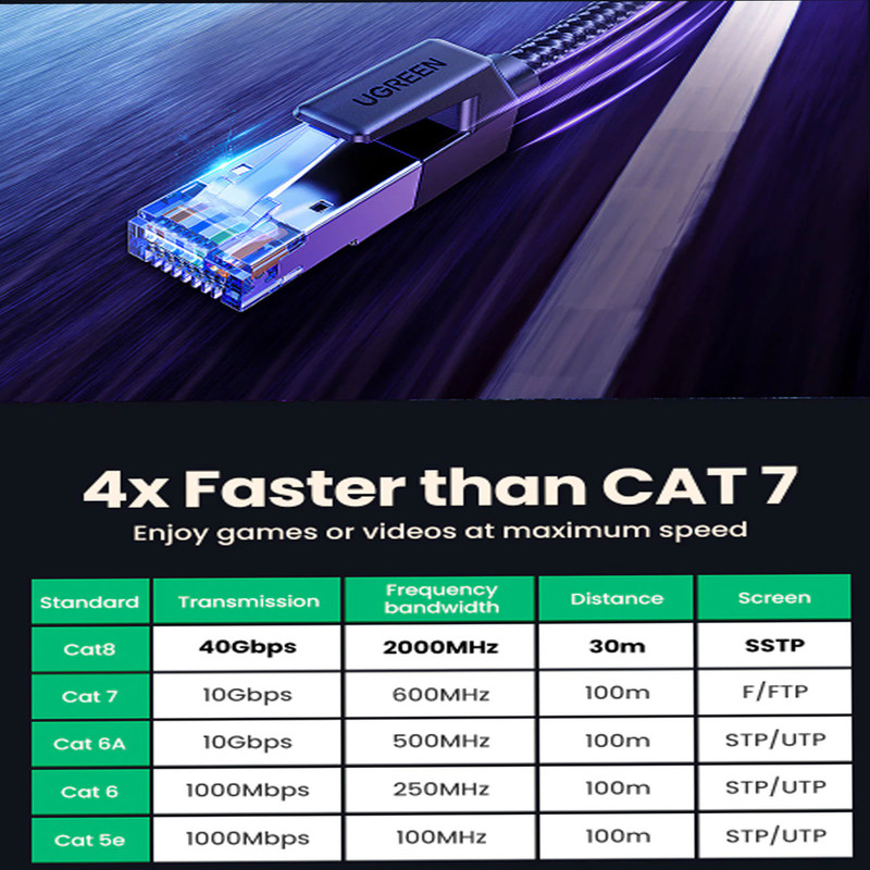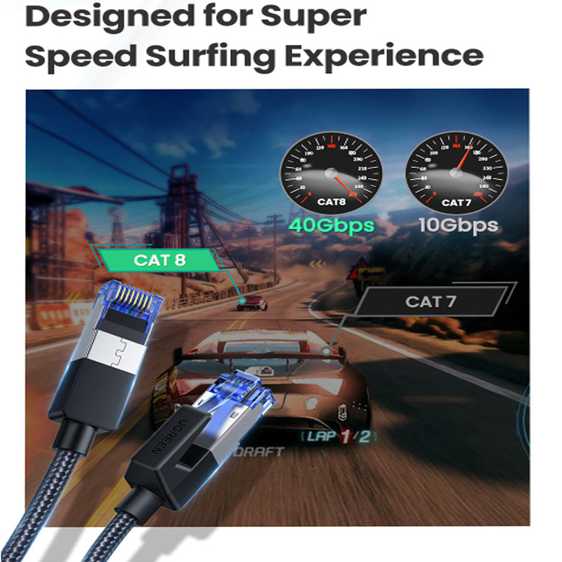 کابل شبکه CAT8 SFTP Ugreen با داشتن کابل ضخیم و آلیاژ تمام مس و سر سوکت فلزی سر طلایی ، قابلیت پشتبانی از فرکانس 2000MHZ و انتقال اطلاعات تا 40Gbps را دارد. از کابل پچ کورد یوگرین CAT8 برای ارتباط بین کامپیوتر و مودم ، سوییچ های گیگا بیتی ، پچ پنل ها و … استفاده می شود.