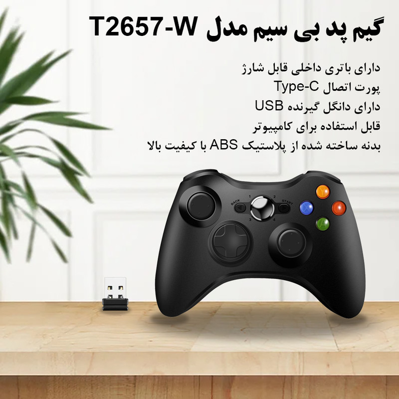 دسته بازی مدل T2657-W یک گیم پد بی سیم مخصوص استفاده برای کامپیوتر می باشد. این گیم پد دارای باتری داخلی قابل شارژ بوده و پورت اتصال آن برای شارژ Type-C می باشد. این گیم پد دارای دانگل گیرنده USB است و فقط قابل استفاده برای کامپیوتر است