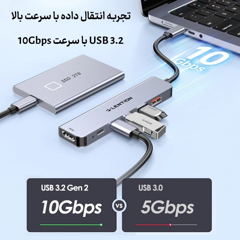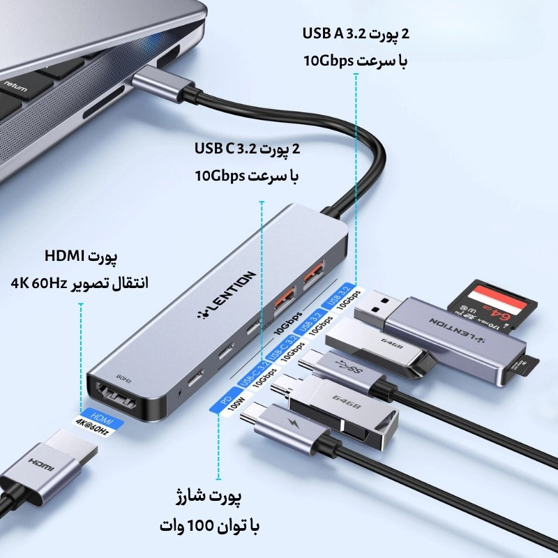 هاب 6 پورت CE37 یک هاب با ویژگی های بسیار عالی برای استفاده روزمره می باشد. این هاب دارای 6 پورت است که شامل پورت ورودی USB C و پورت خروجی HDMI با کیفیت 4K 60Hz، دو پورت USB 3.2 C Gen 2 ، دو پورت USB A 3.2 Gen 2 و یک پورت Type C Charge اشاره کرد. این امکان را به شما میدهد تا دستگاههای مختلف را به هاب متصل کرده و اطلاعات را با سرعت مناسب انتقال دهید. علاوه بر این، پورت شارژ این هاب با پشتیبانی از خروجی شارژ 100 واتی PD3.0، به شما این امکان را میدهد که دستگاههای خود را با سرعت و کارایی بالا شارژ نمایید. این محصول با گارانتی 12 ماهه تعویض سریع، اطمینان از کیفیت و عملکرد آن را به شما ارائه میدهد.این هاب قابلیت انتقال داده با سرعت 10 گیگابایت بر ثانیه با استفاده از USB C 3.2 gen2 را داراست، که به شما این امکان را میدهد تا اطلاعات خود را با سرعت بالا و بدون قطعی انتقال دهید.هاب 6 پورت CE37 از ویژگی پورت شارژ با توان 100 وات نیز بهره مند است. این ویژگی به کاربران این امکان را میدهد تا دستگاههایی با نیاز به شارژ سریع و با توان بالا را مستقیماً به هاب متصل کنند، بدون اینکه نیاز به استفاده از آداپتورهای جداگانه داشته باشند.