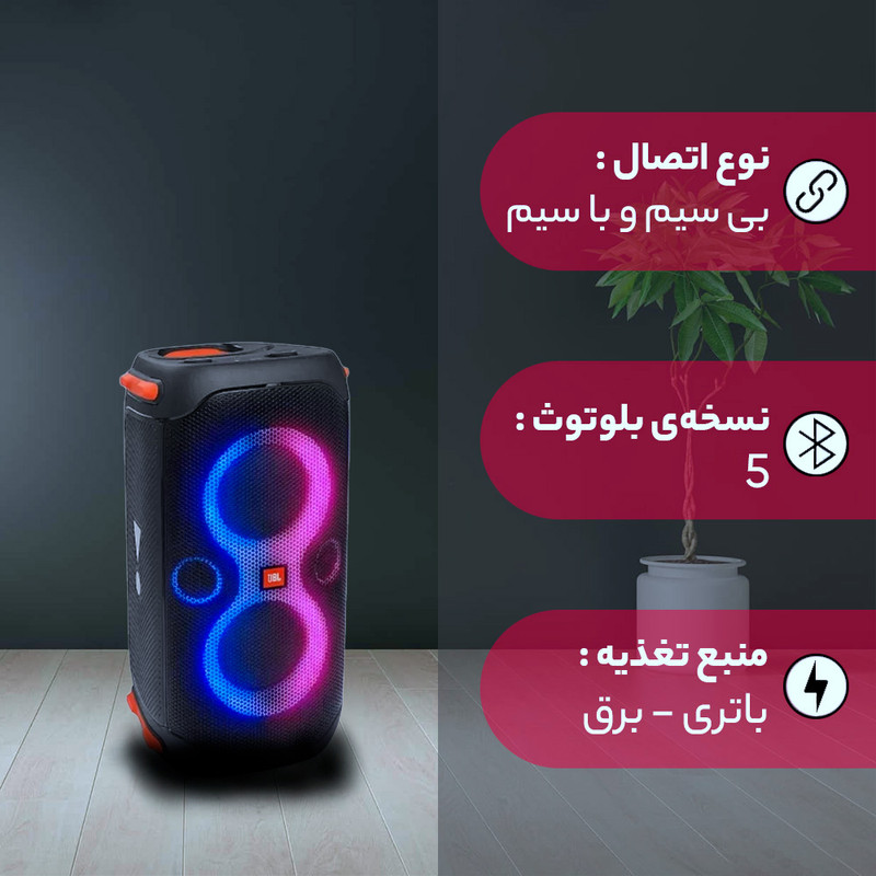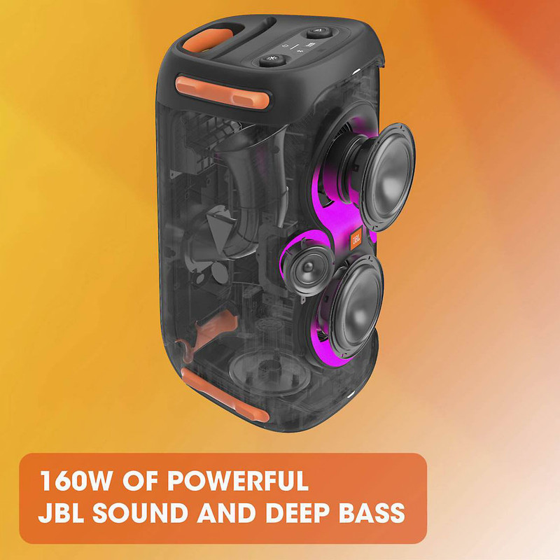 با اسپیکر قدرتمند و قابل حمل JBL PartyBox 110 میتوانید مهمانی را با صدای قدرتمند و نمایش نور پویا شروع کنید. این دستگاه با نورپردازی منحصر به فرد LED هماهنگ شده، با صدای قدرتمند و باس عمیق، برای هر مهمانی، محتوای جدیدی به ارمغان میآورد. اسپیکر JBL PartyBox 110 دارای یک طراحی جمع و جور است که میتوان آن را با یک دست حمل کرد. همراه با صدای با کیفیت JBL Original Pro با ظرفیت قدرت 160 وات با پاسخ فرکانس 45 هرتز تا 20 کیلوهرتز و حساسیت 6 دسی بل همراه است که مجموعه ای از فن آوریهای پیشرفته مانند بلوتوث 5.1 را در خود دارد. اسپیکرهای JBL PartyBox 110 یک اسپیکر بلوتوثی با چراغهای LED زیبا و سیستم ارتقا یافته مدل قبلی این برند است که به فضای بیشتر، مانند یک اثر هنری زیباتر، همراه با دو توییتر و دو ووفر مجهز شده اند. این دستگاه مجموعاً دارای 4 چراغ ، به همراه 2 چراغ چشمک زن در بالا و پایین برای دنبال کردن موسیقی است. به راستی JBL PartyBox 110 به شما تجربه سمعی و بصری بی نظیر و همه جانبه ای میبخشد که هر مهمانی را به یک اثر هنری تبدیل میکند. هر نوع موسیقی با نمایش نور پویا بهتر است. نمایش نور پویا که با ضربان همگام سازی میشود، رنگهای همگام با ضربات را به حرکت در میآورد، در حالی که استروبها و الگوهای قابل تنظیم چشمان شما را خیره میکند. این یک تجربه شنیداری و بصری منحصر به فرد است که هر مهمانی را به یک اثر هنری تبدیل مینماید. همچنین میتوانید مهمانی را تمام روز تأمین کنید. با 12 ساعت دوام باتری قابل شارژ داخلی، پخش ادامه خواهد یافت. ضمن آنکه با درجه مقاومت IPX4 میتوانید آن را در کنار استخر با خود همراه کنید. JBL PartyBox 110 به دلیل دارا بودن گواهینامه IPX4 مقاوم در برابر آب است، بنابراین هرگز نگران خیس شدن و آسیب دیدن آن نخواهید بود. از سویی دیگر، با ورودیهای میکروفون و گیتار، میتوانید استعدادهای خود را هنگام آواز خواندن و بازی نشان دهید.