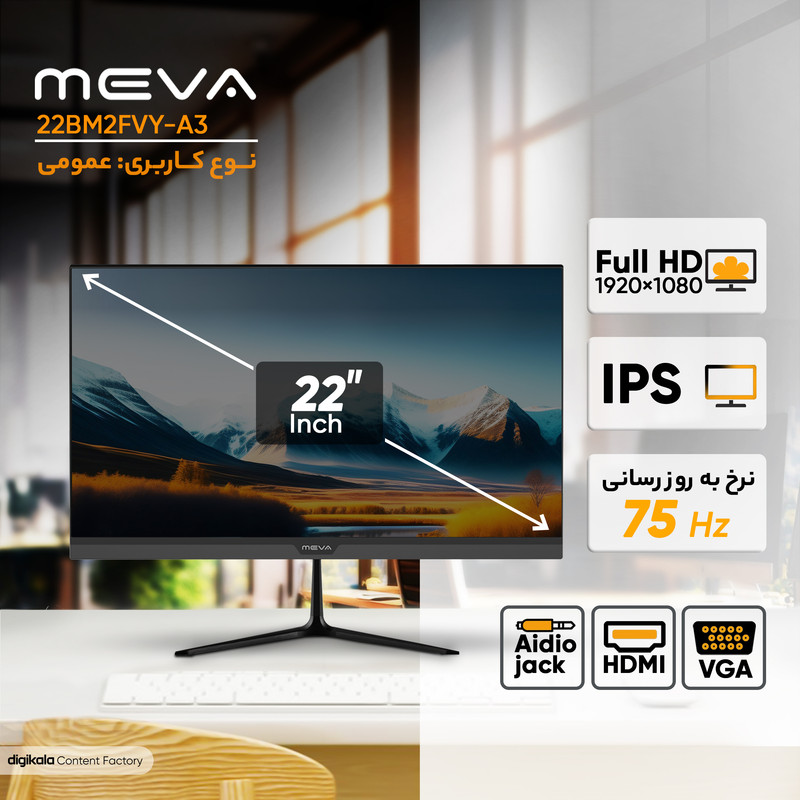 مانیتور میوا مدل 22BM2FVY-A3 گزینهای مناسب برای استفاده روزمره و عمومی در منزل یا محل کار است که از قیمت اقتصادی برخوردار است. طراحی بهروز و چشمنواز به لطف حاشیههای باریک اطراف نمایشگر و پایه فلزی با طراحی ظریف، جلوهی زیبایی به میز کار شما میبخشد. صفحهنمایش 22 اینچی از پنل IPS با رزولوشن 1920 در 1080 بهره میبرد که با وجود روشنایی 220 نیتی و روکش مات، برای استفاده در نور محیطی متوسط کافی خواهد بود. نرخ بهروزرسانی 75 هرتزی از نقاط قوت این مدل محسوب شده و تجربهی روانتری نسبت به رقبای 60 هرتزی ارائه میکند. درگاههای HDMI و VGA در کنار جک 3.5 میلیمتری صدا هم اتصالات مورد نیاز در این رده کاربری را پوشش میدهند. در ضمن این مانیتور به دو عدد بلندگوی داخلی مجهز شده که هریک توان 2 واتی دارند و بسیار کاربردی خواهند بود.