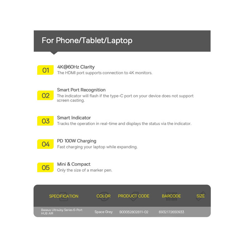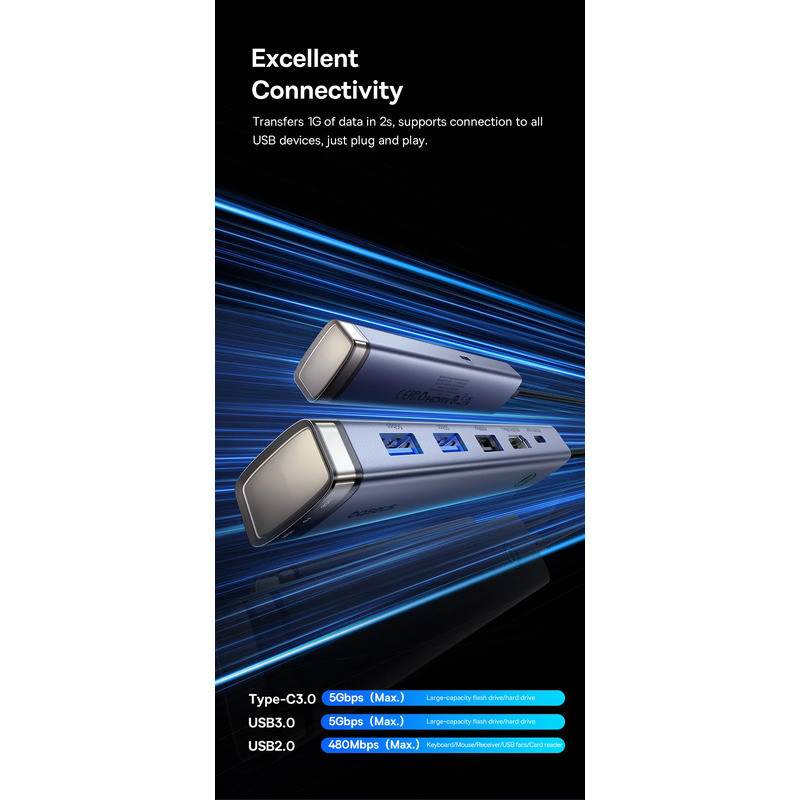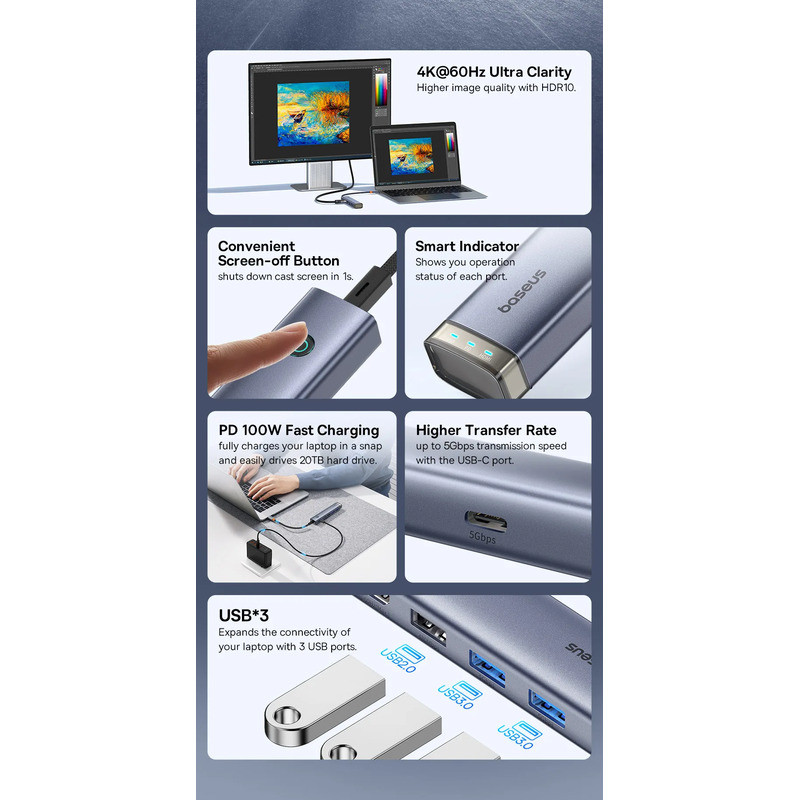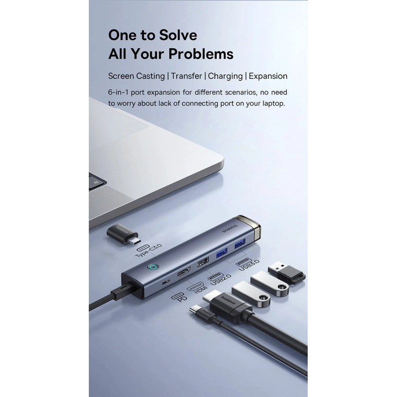 هاب 6 پورت مدل BS-OH166 از Baseus معرفی میشود؛ محصولی حرفهای که تمامی نیازهای شما در اتصال و مدیریت دستگاههای دیجیتال را برطرف میکند. هاب BS-OH166 با طراحی منحصربهفرد و 6 پورت کاربردی، تمامی انتظارات شما از یک ابزار حرفهای را برآورده میسازد. این محصول دارای دو پورت USB 3.0 و یک پورت Type-C است که هر دو از سرعت انتقال داده 5 گیگابیت بر ثانیه پشتیبانی میکنند. این ویژگی، امکان انتقال سریع فایلهای حجیم مانند ویدیوها و تصاویر را فراهم میکند. علاوه بر این، یک پورت USB 2.0 با سرعت انتقال 480 مگابیت بر ثانیه نیز برای اتصال دستگاههای جانبی در اختیار شما قرار دارد. پورت HDMI این هاب، نمایش تصاویر و ویدیوها را با کیفیت 4K و نرخ تازهسازی 60 هرتز ممکن میکند. این ویژگی برای طراحان، گیمرها و علاقهمندان به فیلم و سریال، تجربهای بینظیر فراهم میآورد. یکی از قابلیتهای برجسته این محصول، پورت PD با توان 100 وات است که امکان شارژ سریع لپتاپها، گوشیهای هوشمند و سایر دستگاههای USB-C را فراهم میکند. این هاب با ورودیهای متنوع مانند 5V/3A و 20V/5A و خروجیهای قدرتمند 5V/0.5A و 5V/0.9A، انتخابی انعطافپذیر و قدرتمند است. هاب BS-OH166 با طراحی خاص و استفاده از آلومینیوم آلیاژی 6063، مقاومتی بالا و ظاهری شیک را به همراه دارد. وزن سبک 64 گرمی آن، این محصول را به یک انتخاب ایدهآل برای حمل و استفاده در محیطهای کاری، سفر یا خانه تبدیل کرده است. سازگاری گسترده این هاب با دستگاههای USB-C از جمله مکبوکها، آیپد پرو و گوشیهای هوشمند، آن را به ابزاری چندمنظوره و حرفهای تبدیل کرده است. ب این محصول، انتخابی هوشمندانه برای کسانی است که به دنبال ترکیب عملکرد حرفهای و طراحی مدرن هستند.