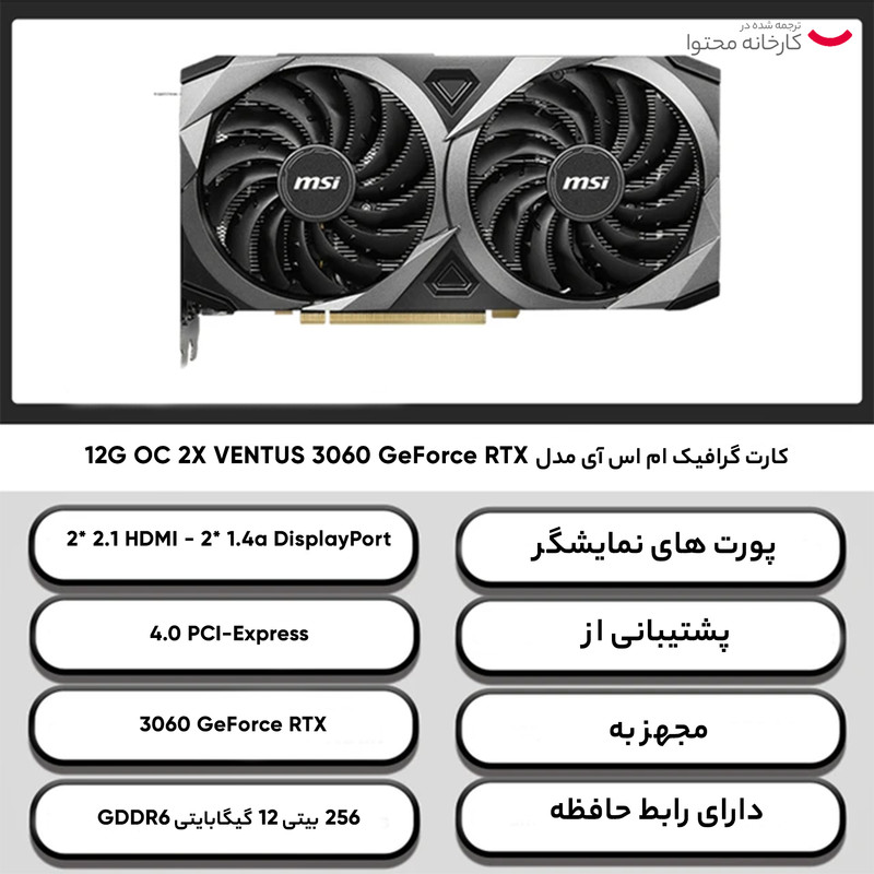 یکی از جذابترین قطعات سختافزاری کامپیوتری و بسیار پرطرفدار کارتهای گرافیکی هستند که میتوان با آن لذتها و کارهای بسیار زیادی را انجام دهیم. کارت گرافیک ام اس آی مدل کارت گرافیک ام اس آی مدل GeForce RTX 3060 VENTUS 2X 12G OC یکی از قدرتمندترین کارتهای گرافیکی مبتنی بر nVIDIA است که میتوانید برای آن تنظیمات اورکلاکینگ داشته باشید و تا حد موردنظر میزان قدرت پردازشی و سرعت بالا یا پایین ببرید. شما روی این کارت گرافیکقدرتمند دارای 4 خروجی متشکل از 3 عدد پورت DisplayPort و 1 عدد HDMI است و شما میتوانید با استفاده از آنها فقط تا 4 نمایش همزمان در 4 نمایشگر متفاوت داشته باشید. حداکثر رزولوشنی که در این کارتگرافیک با آن روبرو هستیم که معادل وضوح 7680x4320 است و میتواند تصویری با کیفیت و نمایش بالا و دقیق جرییات را دارا باشید. چیپست یا پردازشگر گرافیکی مرکزی یا همان GPU آن است که میتواند سنگینترین پردازشها و حتی رندرها را برای شما داشته باشد. یکی از ویژگیهای بسیار بارز و مهم کارت گرافیک اماسآی این است که شما در آن دارای 12 گیگابایت حافظه اختصاصی هستید و دیگر نیازی به استفاده از حافظه SHARE از روی حافظه RAM سیستم خود ندارید و هیچگاه از نظر حافظه کم نمیآورید. از نکات مهندسی شده در این کارتگرافیک برای بُعد خنککنندگی است که با استفاده از هیتسینک و فن انجام میشود. سیستم فنهای خنککننده GeForce RTX 3060 VENTUS 2X 12G OC دوگانه است. GeForce RTX 3060 VENTUS در دل خود دارای 3584 هسته پردازشی است که بهصورت موازی با یکدیگر کار و تعامل داده و اطلاعات دارند و سرعت بالایی را برای شما در پردازشهای گرافیکی بهارمغان میآورند.