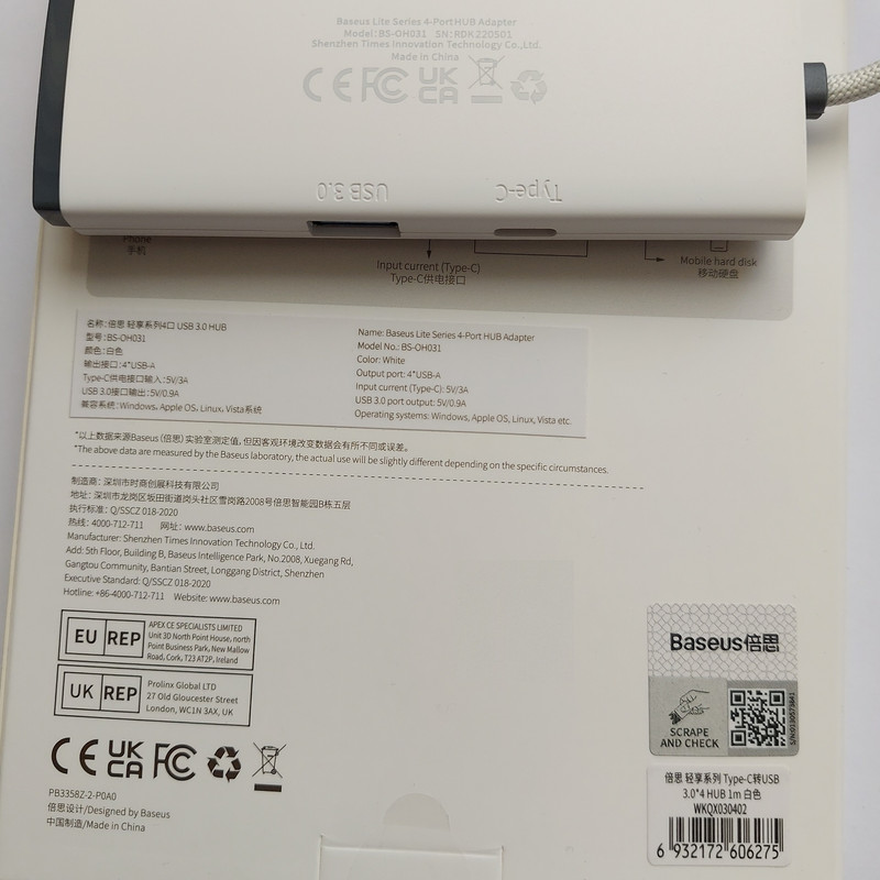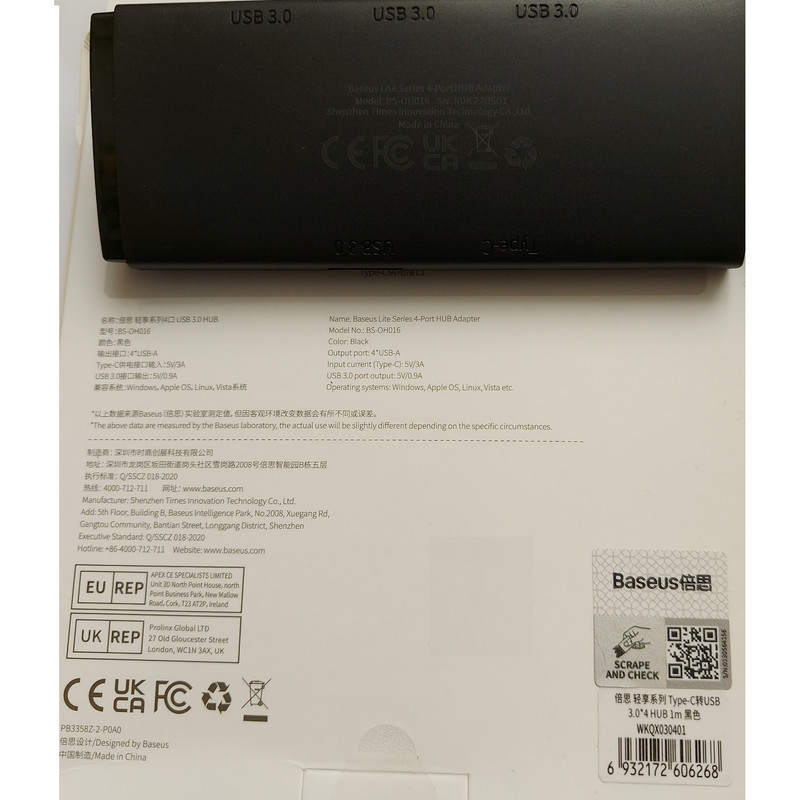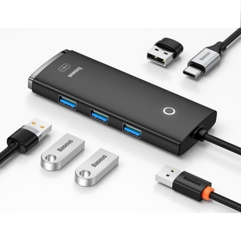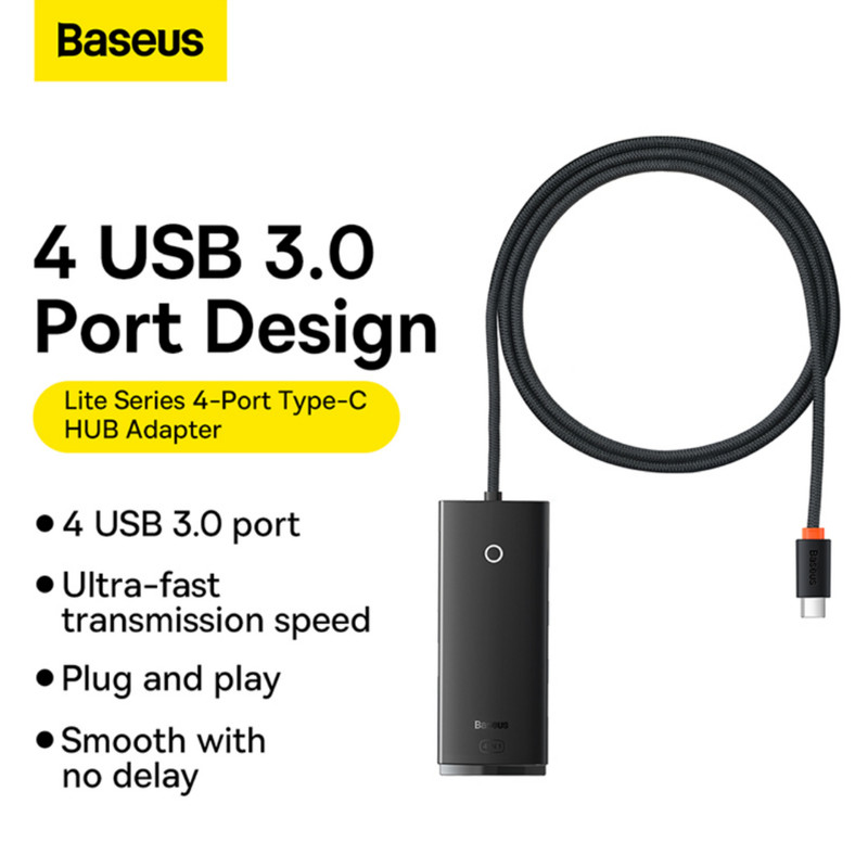 هاب 4 پورت بیسوس Baseus Lite Series WKQX03040 دارای 4 پورت USB 3.0 است که با ورودی Type-C به سیستم وصل میشود. این هاب در دو رنگ مشکی با کد جعبه WKQX030401 و کد محصول BS-OH016 و رنگ سفید با کد جعبه WKQX030402 و کد محصول BS-OH031 با کابل 1 متری تایپ سی متصل به دستگاه تولید شده است.