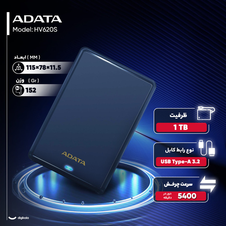 هارد اکسترنال ای دیتا مدل HV620S ظرفیت یک ترابایت دارای رابط USB Type-A 3.2