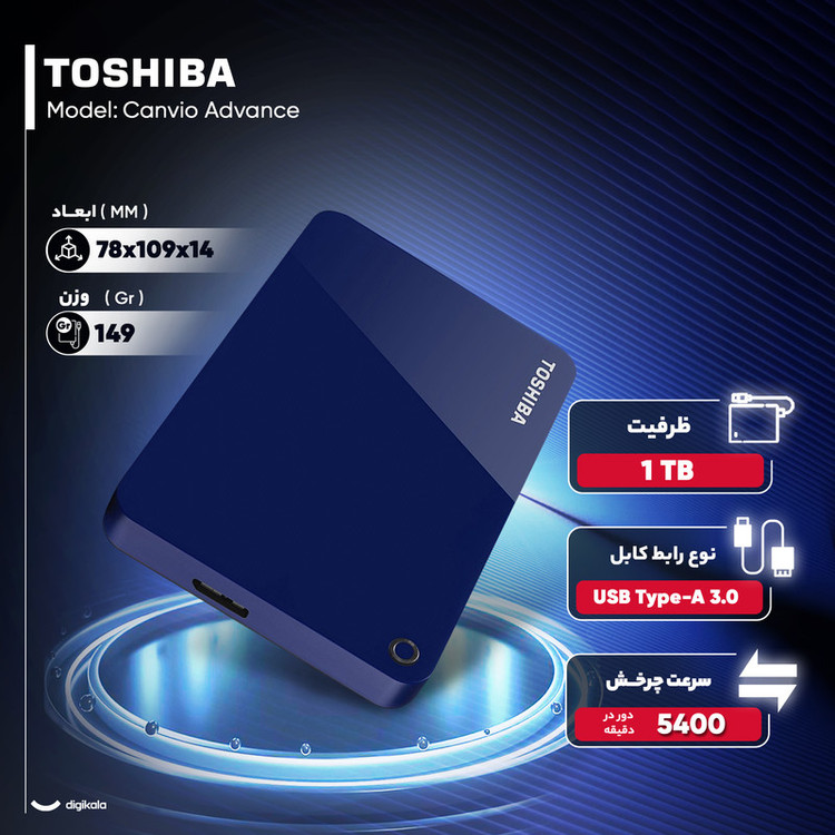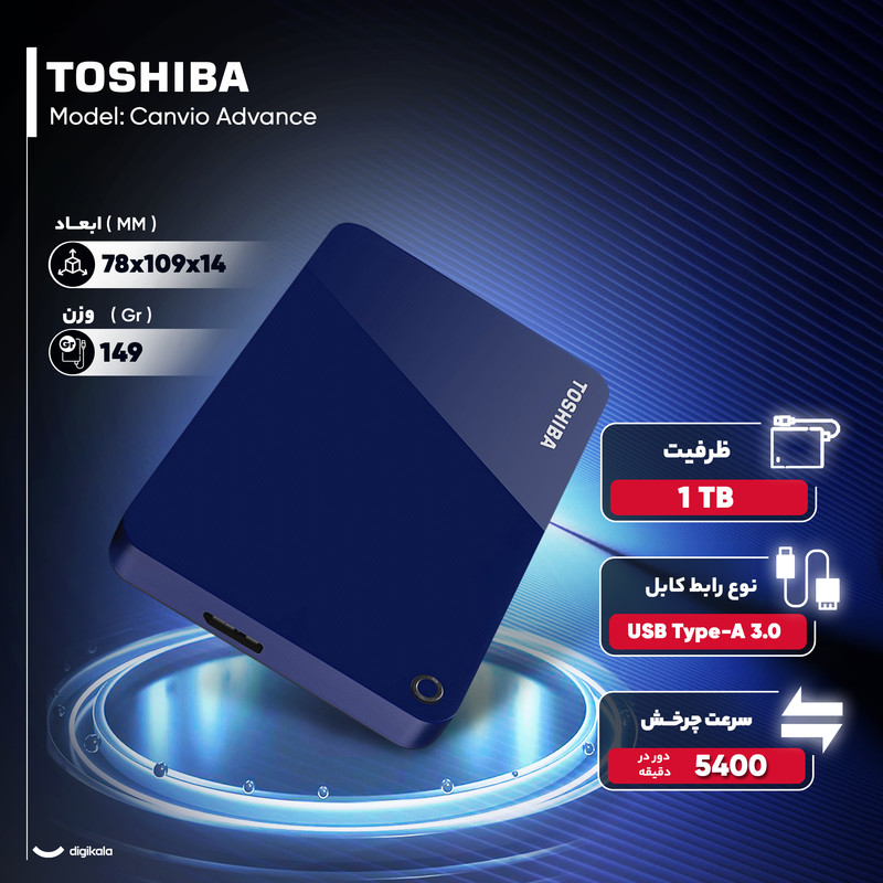 هارد «Canvio Advance» محصولی از شرکت «توشیبا» است که از طریق درگاه USB3.0 به کامپیوتر متصل میشود. شرکت توشیبا یکی از برندهای معتبر در حوزهی تولید تجهیزات ذخیرهسازی است که حافظهی داخلی بسیاری از لپ تاپها و هاردهای اکسترنال ساخته شده توسط شرکتهای دیگر را تولید میکند. بهره بردن از درگاه USB3.0 به عنوان رابط هارد با کامپیوتر باعث شده که کاربر بتواند با سرعت زیاد به انتقال اطلاعات بپردازد. این هارد از نوع اکسترنال بوده و برای تامین انرژی خود نیازی به آداپتور برق ندارد. این موضوع باعث شده که از Canvio Advance بتوان در هر زمانی به راحتی استفاده کرد. طراحی مینیمال در این محصول آنرا به یک هارد اکسترنال بسیار شیک تبدیل کرده است. شرکت توشیبا همراه با ارائهی Canvio Advance نرم افزاری را برای تهیهی نسخهی پشتیبان از هارد توسعه داده است که میتواند بسیار کاربردی باشد. با توجه به آنکه هارد اکسترنال Canvio Advance در رنگهای مختلفی ارائه شده، میتوان با هر سلیقهای دست به انتخاب زد. هارد Canvio Advance ابعاد و وزن بسیار مناسبی دارد و کاربر میتوان آن را در کیف لپ تاپ خود قرار داده و همیشه با خود همراه داشته باشد.