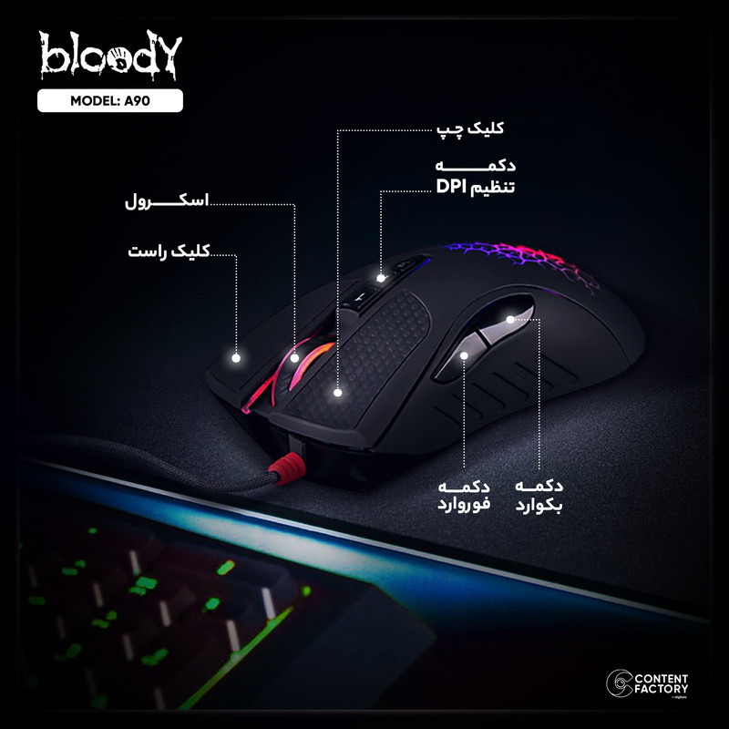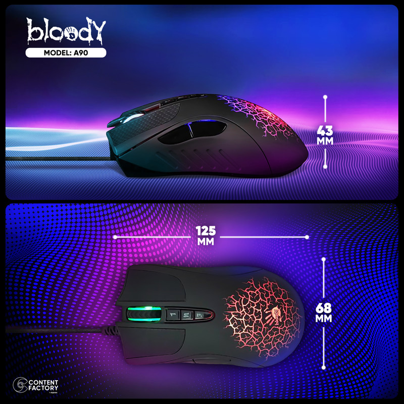 ماوس A90 از سری محصولات BLOODY ، توسط شرکت A4TECH طراحی شده و بر اساس جدیدترین متدهای استاندارد دقت و سرعت به بازار عرضه شده است. این ماوس قابلیت اهداف را با سرعت و دقت بالا فراهم میکند. یکی از ویژگیهای بارز محصولات BLOODY ظاهر زیبا و جذاب آنها است که برای گیمرها و سایر کاربران جذابیت دارد.