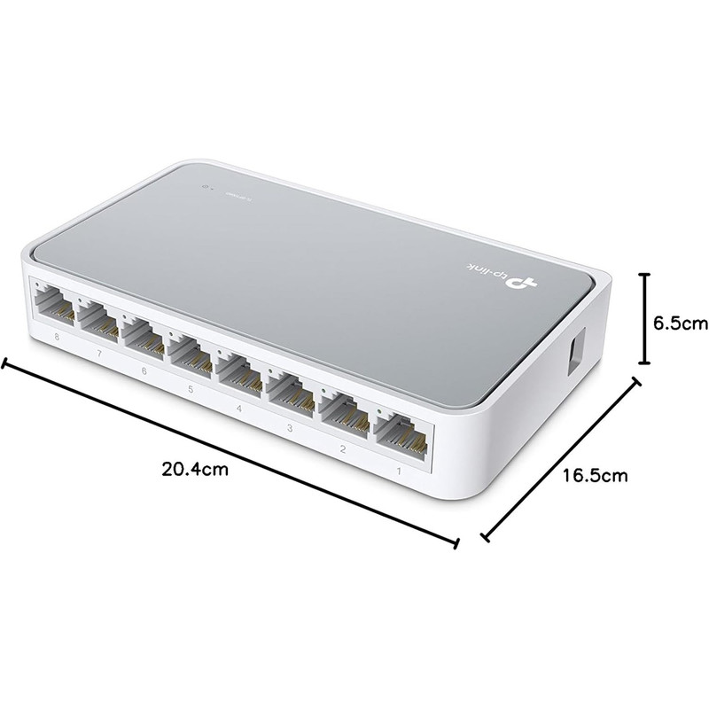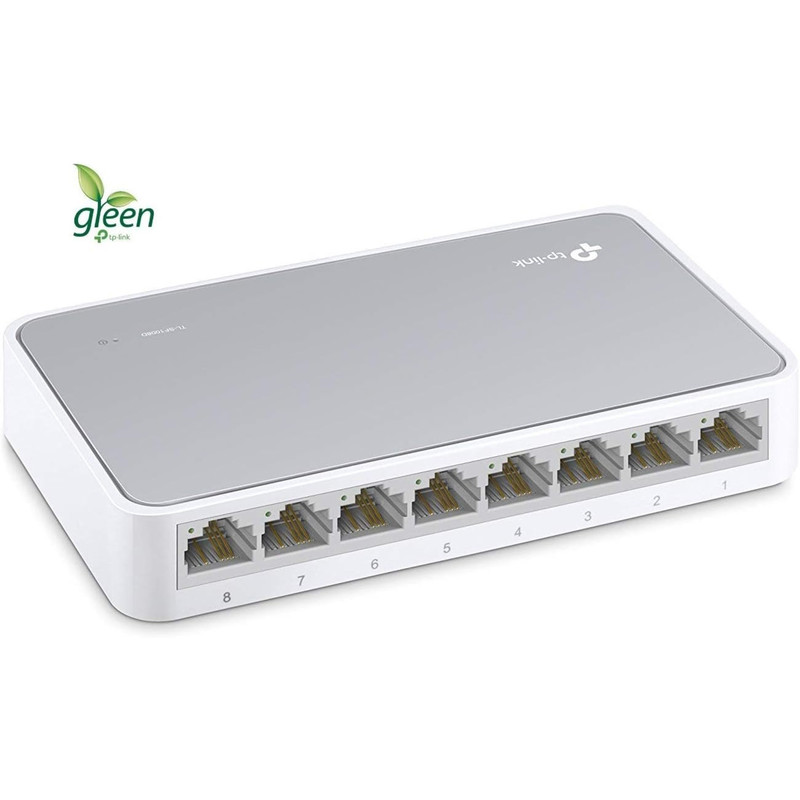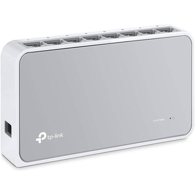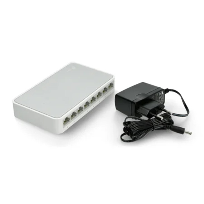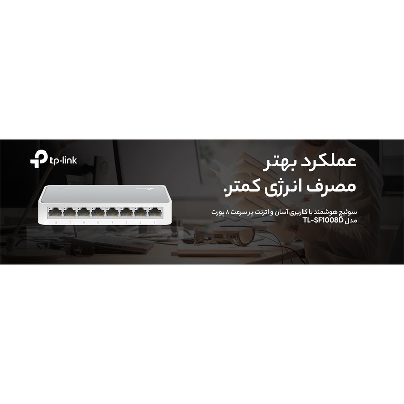 سوییچ «TL-SF1008D Ver 12.0» محصولی از برند «تی پی-لینک» (TP-LINK) است. این سوییچ دارای 8 پورت LAN است و میتواند برای گسترش شبکه و متصلکردن تعداد بیشتری از کاربران به آن مورد استفاده قرار بگیرد. پورتهای LAN بهکاررفته در TL-SF1008D Ver 12.0 از نوع 10/100 مگابیتی هستند که این سوییچ را به انتخاب مناسبی برای شبکههای خانگی تبدیل میکنند. تمام پورتهای LAN به قابلیت Auto MDI/MDIX مجهز هستند و میتوانید از هر نوع کابل مجهز به سوکت RJ45 روی آنها استفاده کنید. با استفاده از چنین سوییچی میتوانید کامپیوتر دسکتاپ و لپتاپ، کنسول بازی خانگی، ذخیرهساز NAS و دوربینهای نظارتی منزلتان را به شبکه وصل کنید. ظرفیت سوییچینگ در این محصول 1.6 گیگابیت بر ثانیه است و پهنای باند انتقال داده شده، در حالت استفاده، از Full Duplex Mode تا 200 مگابیت بر ثانیه خواهد رسید. LED نشاندهندهی روشنبودن سوییچ، در قسمت بالای بدنه تعبیه شده LED های نشاندهندهی فعالیت هر پورت، روی همان پورت قرار گرفتهاند. برق مورد نیاز سوییچ TL-SF1008D Ver 12.0، توسط آداپتور خارجی تامین میشود و با استفاده از Green Technology بهکاررفته درون سوییچ، میزان مصرف برق در آن بسیار ناچیز است.