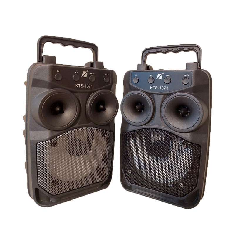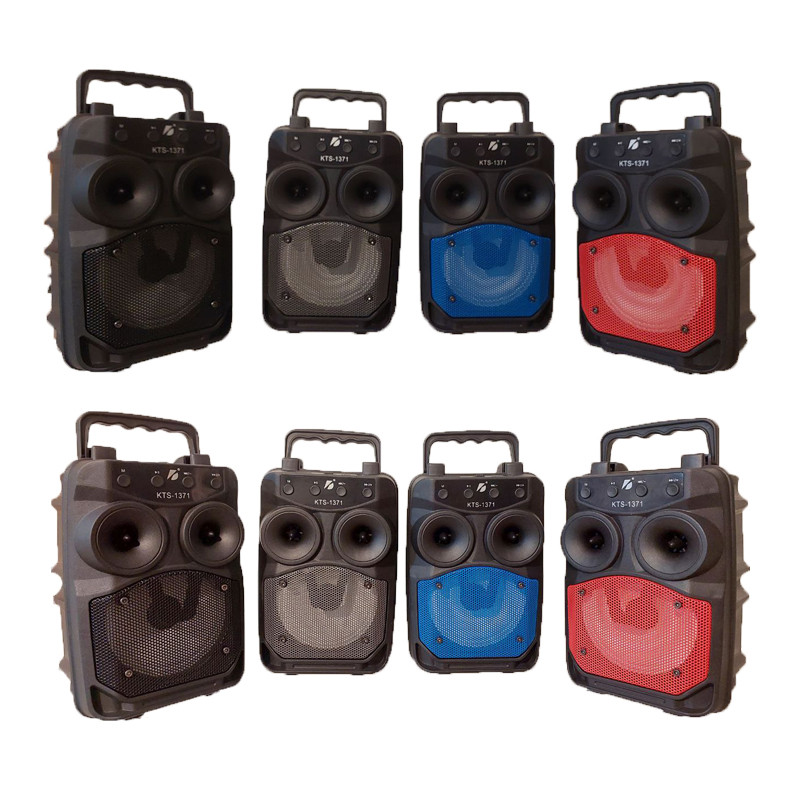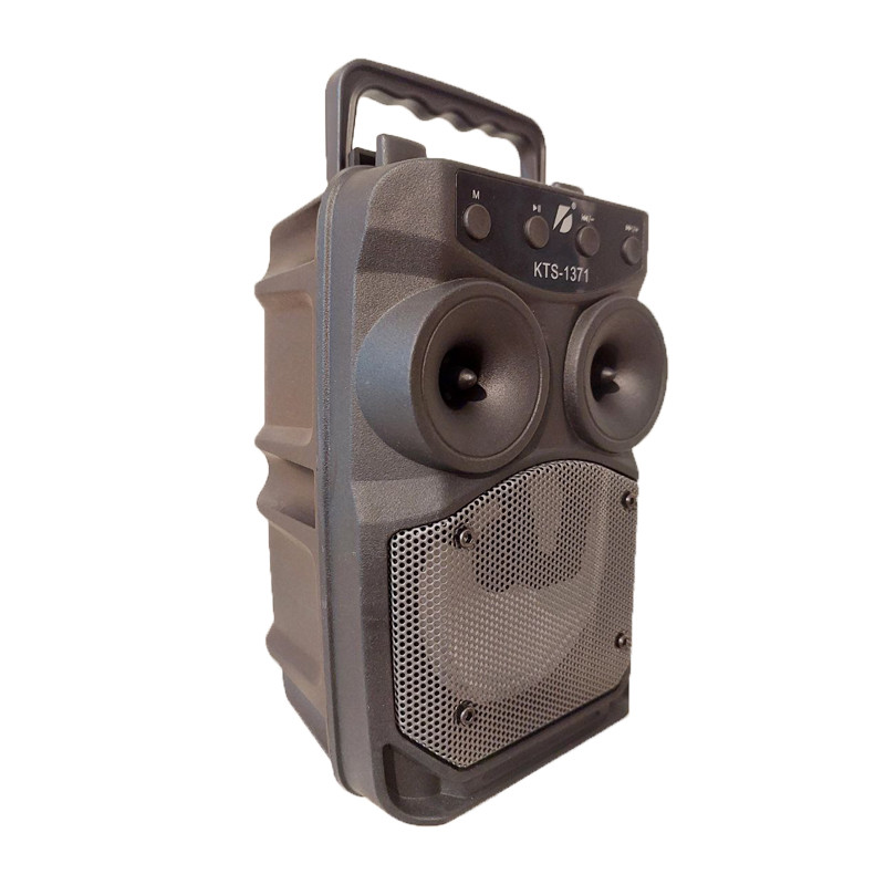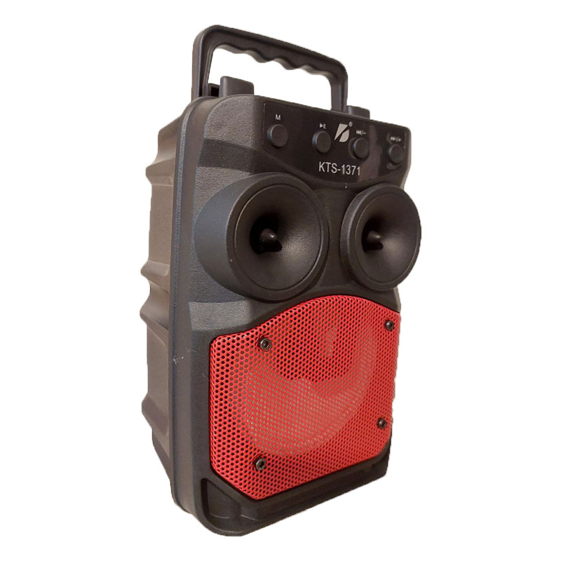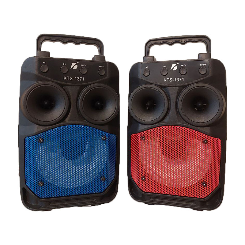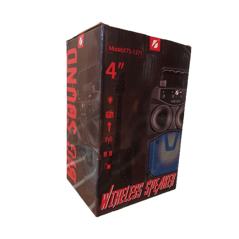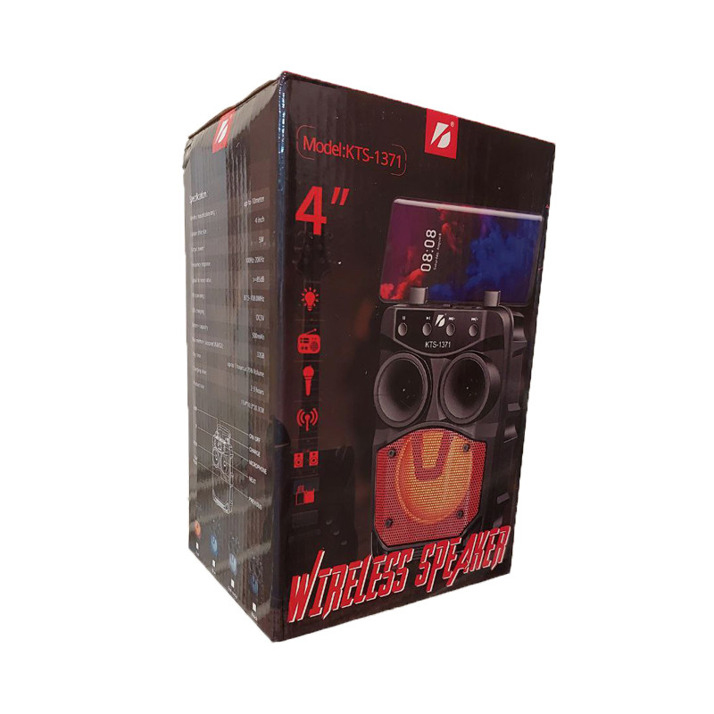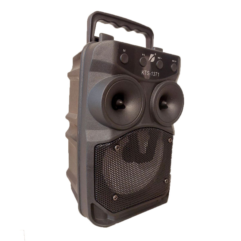 این اسپیکر بلوتوثی مدل kts-1371 تولید شده توسط برند KTS کی تی اس است که با توجه به حجم آن و طراحی ساختی که دارد می تواند به سادگی حمل شود و در هر مکانی استفاده شود. طراحی ساخت این نوع اسپیکر به گونه ای است که فضای زیادی را اشتغال نمی کند و با توجه به دسته ای که بر روی آن تعبیه شده خیلی راحت جا به جا می شود. این اسپیکر برند کی تی اس در چهار رنگ آبی، قرمز، مشکی و خاکستری طراحی و ساخته شده است تا برای هر سلیقه ای قابل استفاده باشد. تولید و ساخت آن با کیفیت بالا انجام شده و طراحی خیلی شیک و کاربر پسندی دارد. هنگام نگاه کردن از رو به رو شبیه به یک شکلک خندان به نظر می رسد که جلوه خاصی به آن داده است. این اسپیکر بلوتوثی کیفیت صدای فوق العاده ای دارد و در فضاهای بزرگ هم قابل استفاده است. در قسمت جلویی آن نور RGB کار شده است که هنگام پخش ترکیب رنگ زیبایی را به نمایش میگذارد که زیبایی خاصی را به آن می بخشد. پخش صدای آن بدون هیچ خط و خشی امکان پذیر است و برای شما تجربه گوش دادن به موسیقی با جلوه های صوتی تصویری را فراهم می کند. به راحتی به بلوتوث دستگاه شما متصل می شود و امکان استفاده از فلش و یا کارت حافظه با درگاه USB هم فراهم میکند. یکی دیگر از قابلیت های عالی این مدل اسپیکر بخش هولدر گوشی موبایل بر روی آن است که خیلی خوب طراحی شده و گوشی شما را در هنگام پخش بر روی خود نگه می دارد.