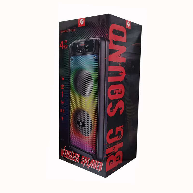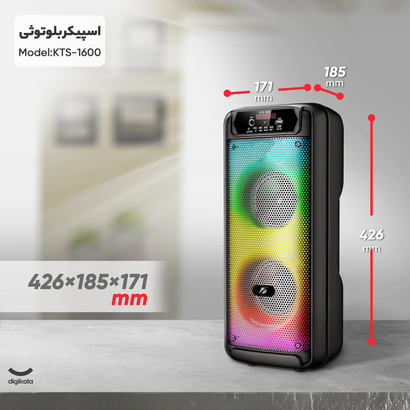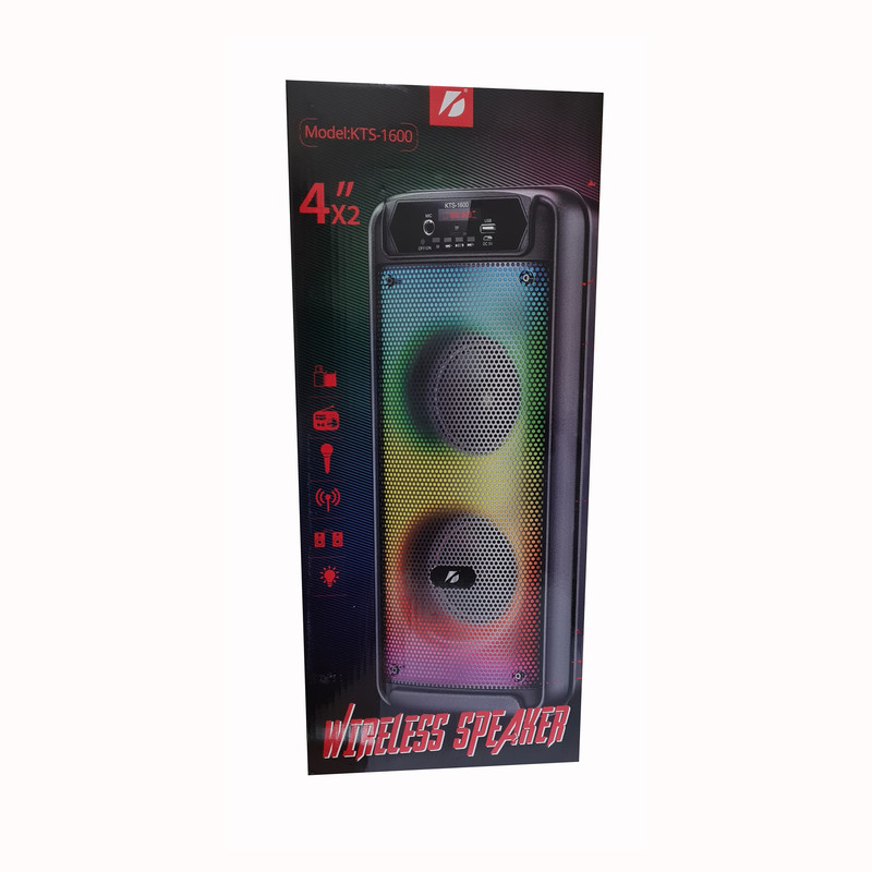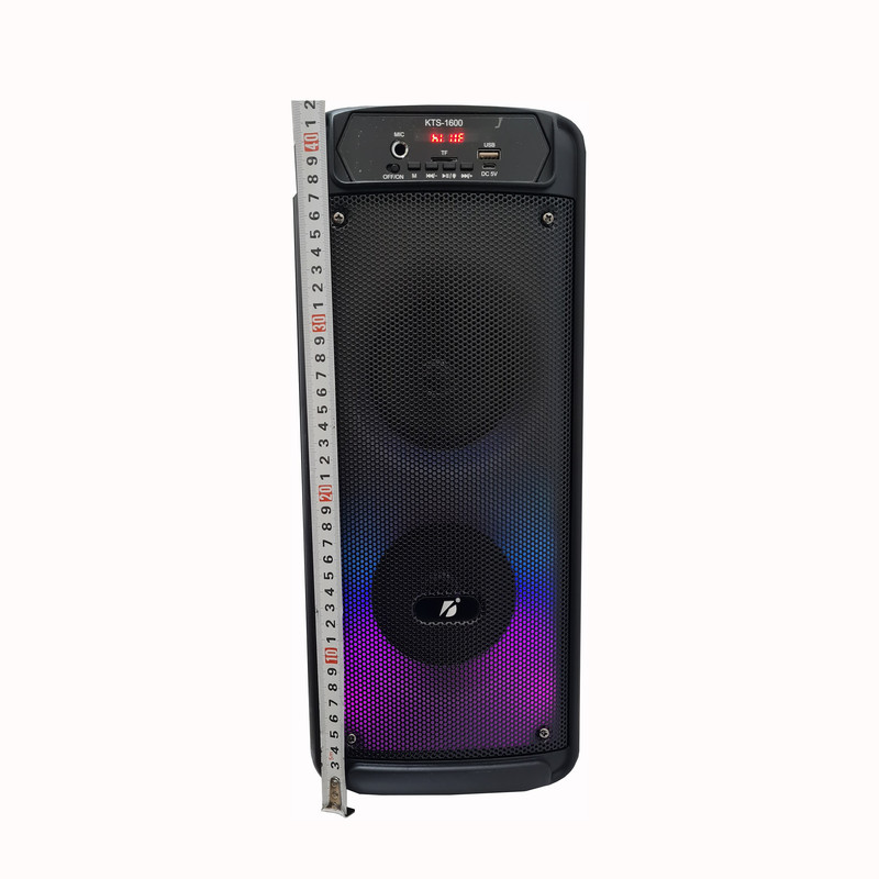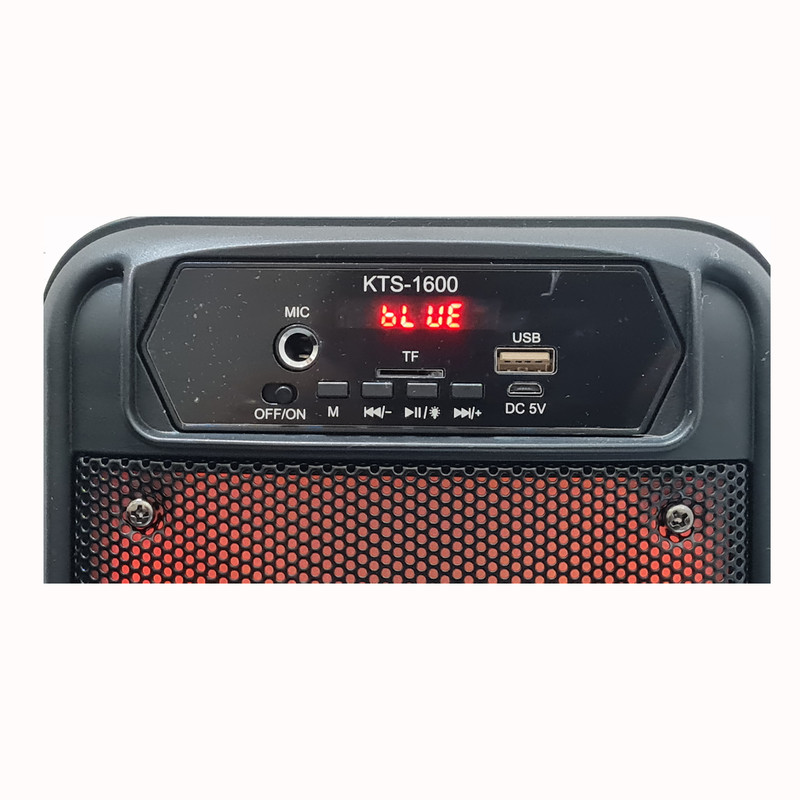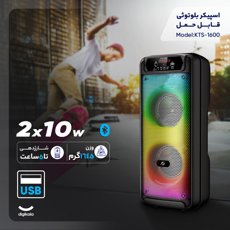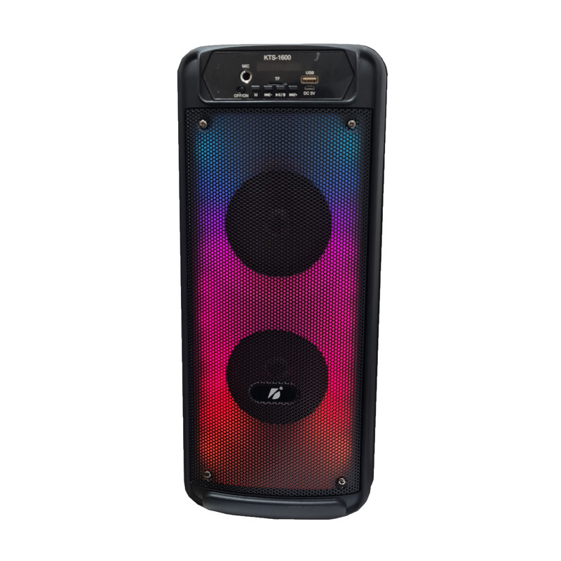 اسپیکر «1600» محصولی از برند کی تی اس است. اسپیکر بلوتوثی رقص نور دار خوش ساخت با بدنه مقاوم در برابر ضربه و فشار است که در ابعادی متناسب با بهره مندی از طراحی زیبا و نورپردازی داخلی RGB تولید شده و با ویژگیهای کاربردی خود مناسب استفاده در جمعهای دوستانه و جشنهای شما است. این اسپیکر دارای ابعاد نسبتا بزرگی است و با توجه به وزن مناسب ، شما را قادر میسازد که به راحتی از آن در تفریحات ، مراسمات و مهمانیها استفاده کرده و لذت ببرید . این اسپیکر دارای دو عدد باند چهار اینچی با توان خروجی کلی (2x10)20 وات بوده که با توجه به حجم صدای قابل قبول و ورودی میکروفون شما را قادر میسازد تا به عنوان بلندگو نیز در تفریحات و موارد مورد نظر خود استفاده کنید. ورودیهای USB و مموری کارت و علی الخصوص اتصال از طریق بلوتوث شما را در پخش موسیقی از هر وسیله دلخواه یاری داده تا در هر جا و مکان، امکان پخش موسیقی را داشته باشید و لذت ببرید. باتری داخلی و قابل شارژ 1800 میلیآمپری که درون دستگاه قرار دارد آن را قادر میسازد بیشتر از 4 تا 5 ساعت مداوم برای شما به پخش موسیقی بپردازد که این زمان با توجه به میزان مصرف شارژ اسپیکرهای بزرگ بسیار قابل قبول بوده و این حسن علاوه بر طراحی زیبا طرفداران خاصی را به خود اختصاص داده است. از قابلیتهای دیگر موجود در این دستگاه اتصال میکروفون و همخوانی با آهنگ مورد علاقهتان است. لازم به ذکر است کلیدهای فیزیکی موجود در قسمت بالایی بدنه. برای مدیریت و انجام تنظیمات مختلف مانند تغییر موزیک در حال پخش. توقف یا پخش مجدد، تنظیم ولوم صدا، تغییر مود، تنظیم نورپردازی تعبیه شدهاند.