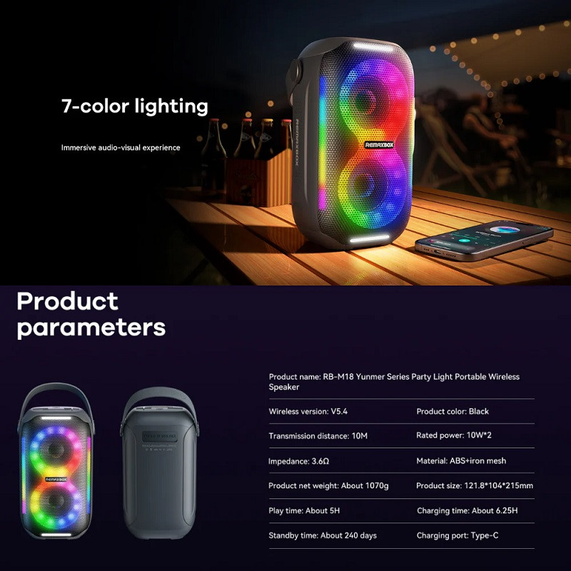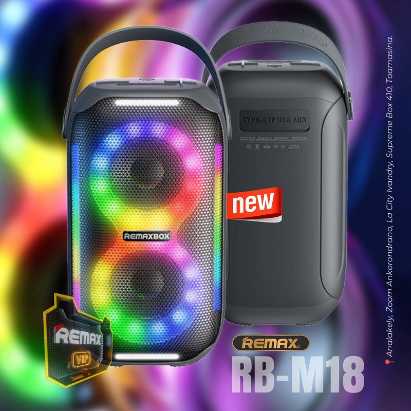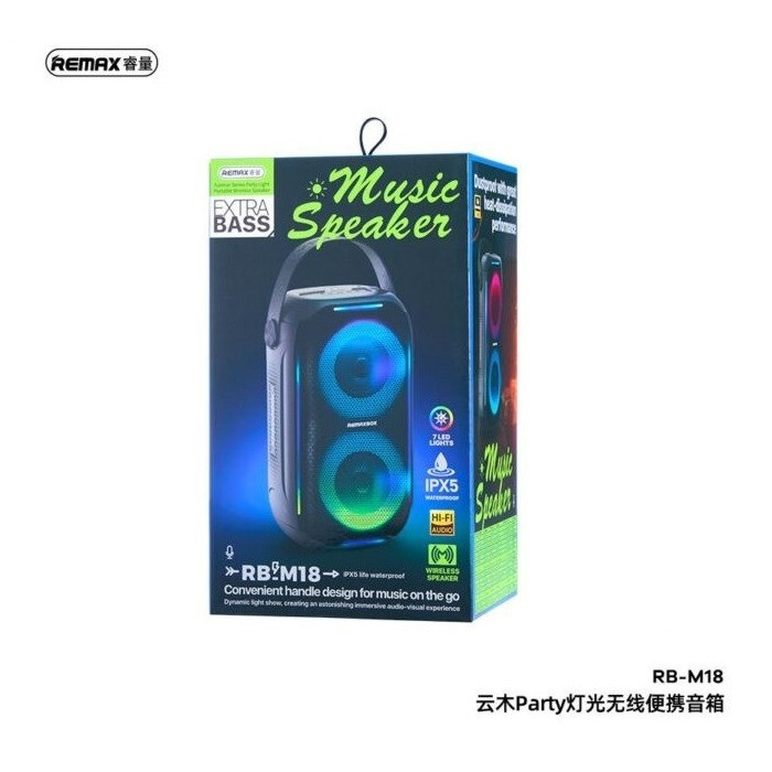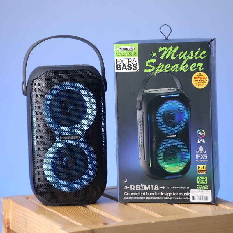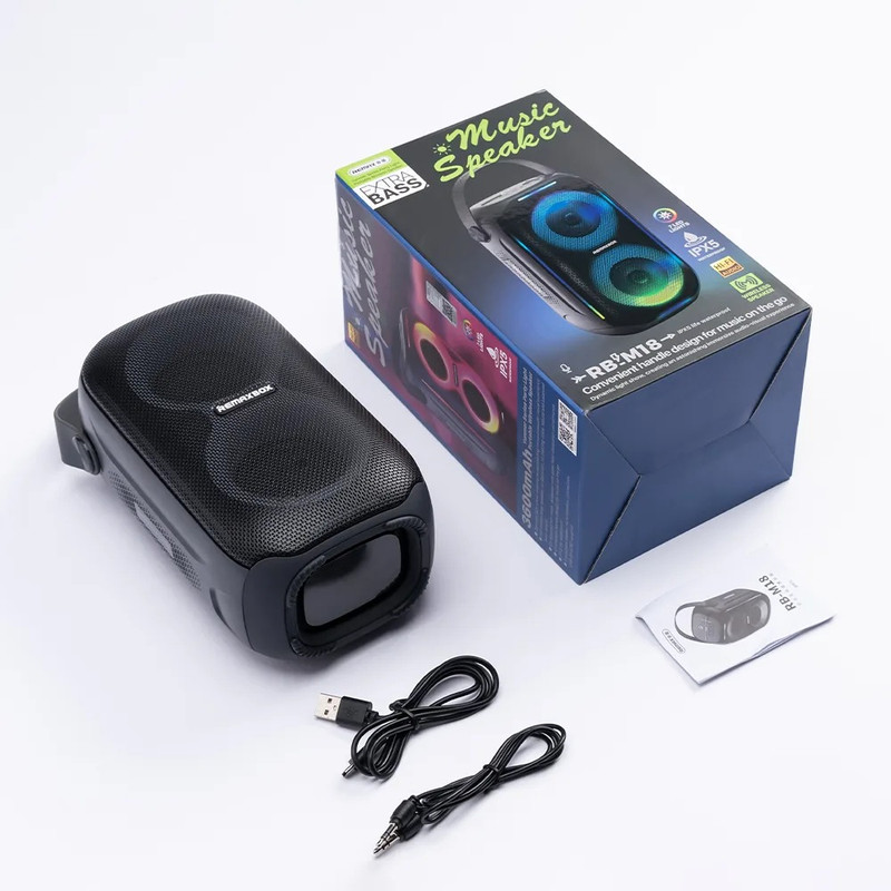 اسپیکر بلوتوثی ریمکس RB-M18 یک محصول صوتی مدرن است که با ادغام بسیاری از ویژگیهای برجسته، تجربه موسیقی بینظیری را در هر فضایی به ارمغان میآورد.طراحی قابل حمل با دسته راحت موجب شده در هر فضایی براحتی قرارگیرد و براحتی آنرا به پیک نیک یا هررویدادی در فضای باز ببریدیا به راحتی آن را روی میز، قفسه کتاب یا هر سطح دیگری قرار دهید.این اسپیکر از ترکیبی از مواد ABS با کیفیت بالا و شبکه آهنی روکش شده با روغن فلزی ساخته شده است که موجب ظرافت ودرعین حال دوام بیشتر آن شده است. این جنس ضدخش، ضد اثر انگشت و به راحتی تمیز میشود و ظاهر محصول را مانندروز اول نگه میدارد.مجهز به سیستم بلندگوی دوگانه با برد کامل وکیفیت صدای HI-FI Audio و ظرفیت کلی 20 وات است که صدایی قدرتمندو واضح را ارائه میدهد.محدودهی بیس وسیع،طبیعی،عمیق و قدرتمندی را تولید میکند که برای موسیقی EDM، ریمیکس، پاپ یا راک ایدهآل است. فرکانسهای میانی و بالایی با جزئیات کامل و کاملاً متعادل هستند وکیفیت صدای واضح و واقعگرایانهای را ارائه میدهند که برای ژانرهای موسیقی مانند آکوستیک، جاز یا کلاسیک بسیارمناسب است.دارای سیستم نورپردازی LED هفت رنگ یکپارچه است که جلوههای نوری چشمگیری را ارائه داده که با ریتم موسیقی تغییر کرده و نه تنها یک فضای سرگرمی رنگارنگ ایجاد میکند، بلکه دستگاه شما را در هر مهمانی به مرکز توجه تبدیل میکند.اسپیکر RB-M18 REMAX BOX با استاندارد ضد آب IPX5 طراحی شده است ومیتوانید با خیال راحت در فضای باز ازآن استفاده کنید، بدون اینکه نگران آسیب دیدن توسط قطرات آب، مه یا باران سبک باشید.مستقیماً از طریق کابل AUX به دستگاههایی مانند تلفن، لپتاپ یا رایانه متصل میشود.دارای بلوتوث نسخه ۵.۴ است که اتصال سریع و پایدار را تا برد ۱۰ متر امکانپذیر میکند. تأخیرکم، صدای هماهنگ را تضمین میکند، از پخش موسیقی مستقیماً از طریق فلش USB پشتیبانی کرده وبا طیف گستردهای از کارتهای حافظه سازگار است همچنین دارای رادیو FM داخلی است.دارای عمر باتری چشمگیری است و به یک باتری 3600 میلیآمپر ساعتی مجهز شده است که امکان پخش موسیقی تا 5 ساعت مداوم را فراهم میکند. و میتوانید بدون وقفه در مهمانیها یا هنگام کار از موسیقی لذت ببرید.در صورت عدم استفاده، بلندگو میتواند تا ۲۴۰ روز در حالت آماده به کار باقی بماند .